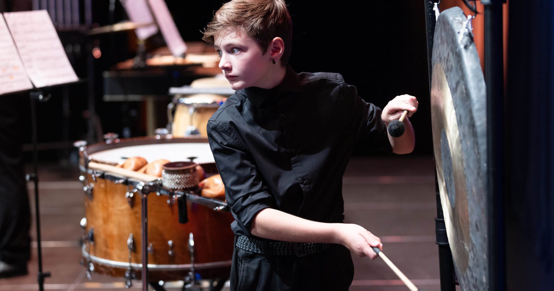 Junger Musiker spielt begeistert auf der Pauke während eines Konzerts.